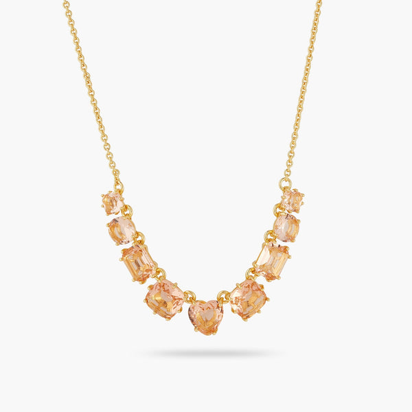 Golden fine necklace, 9 crystal stones faceted in the apricot tones of different shapes, stone cut in the heart in the center of the jewelry, chain and golden brass frame...