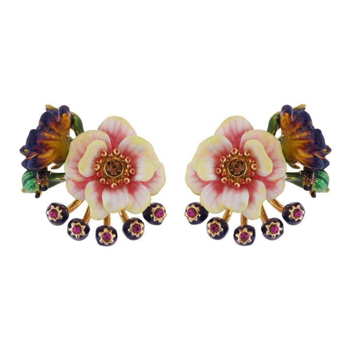 \nThese earrings are made of: Gold plated brass (14k), stud in surgical steel, rhinestones and hand-painted enamel. Nickel free. \n \nDimension: Length: 2cm / Width: 2.3cm. Clasp's height is adjustable. \n \nShipping