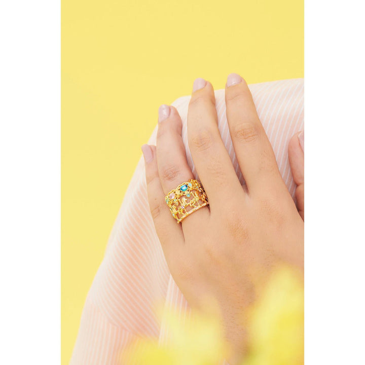 Solitaire Ring : Gold-plated brass, hand-enamelled and enhanced with multicolored zirconium crystals and oxides