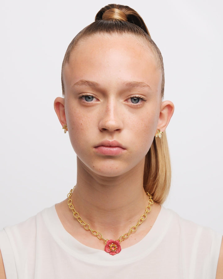 These post earrings showcase gold-plated leaves paved with cubic zirconia. La Maison Les Néréides unveils the Winter Velvet collection to celebrate snowdrops and hellebores, the last flowers of the season. A bullfinch twirls here and there in this collection with particularly intricate settings.