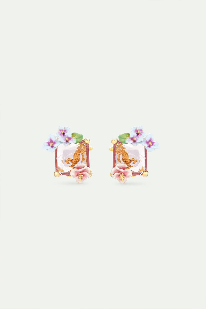 Emerald-cut pink stone earrings, hiding a small golden lizard, adorned with hand-enamelled hydrangea flowers and hollyhocks. The collection Hortense's Garden is a sweet celebration of hydrangeas and summer gardens. Its different shades of pink captivate us, symbolising a beating heart, as reminded by its bouquet. Pink is the colour of budding love, in the guise of a flower that, even in the absence of water, loses none of its splendour.
