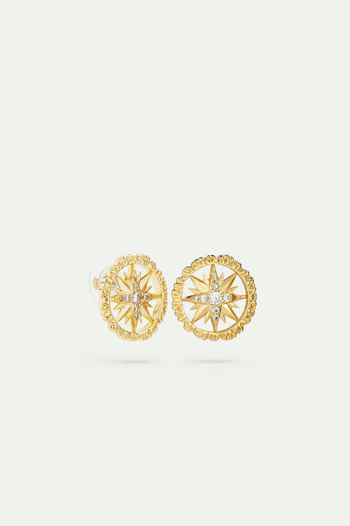 Gold-plated compass rose earrings set with cubic zirconia. Gold-plated brass with a texture that resembles the organic look of rock. With Secret Trail, the Rock Flower collection comes in a set of gold-plated jewellery adorned with fine stones, and inspired by rocky mountains.