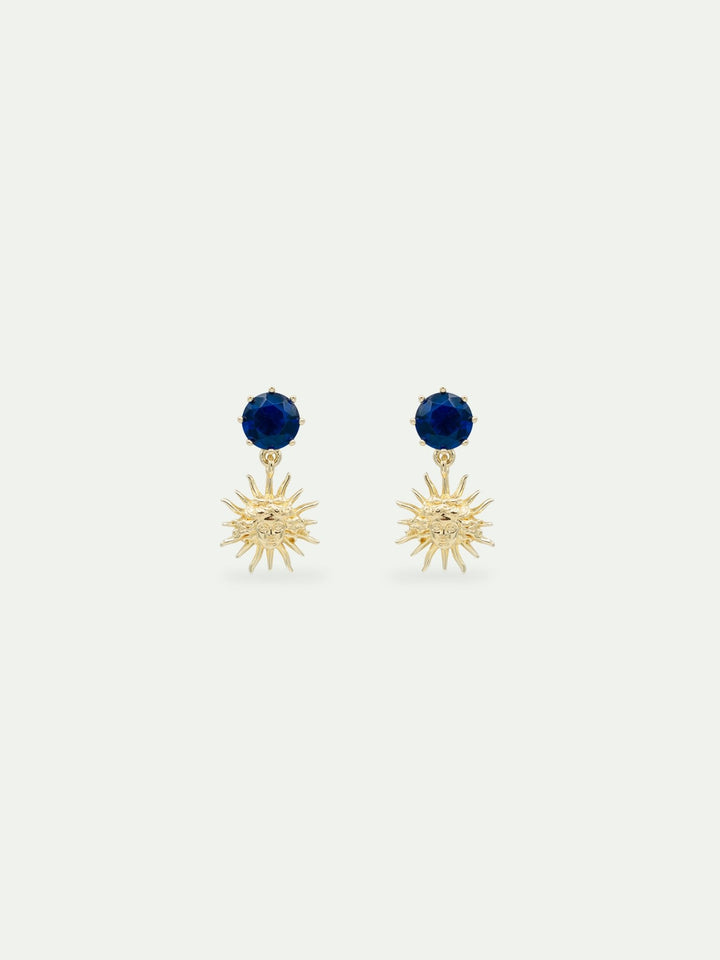 Royal blue cut glass round stone sleeper earrings, dangling gold-plated brass sun. Les Néréides has worked with the Palace of Versailles to design jewellery inspired by the symbolism of Louis XIV, architectural elements and the lush gardens of the palace.