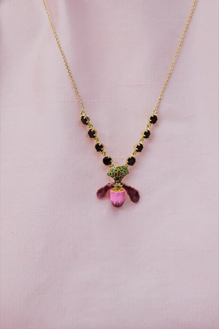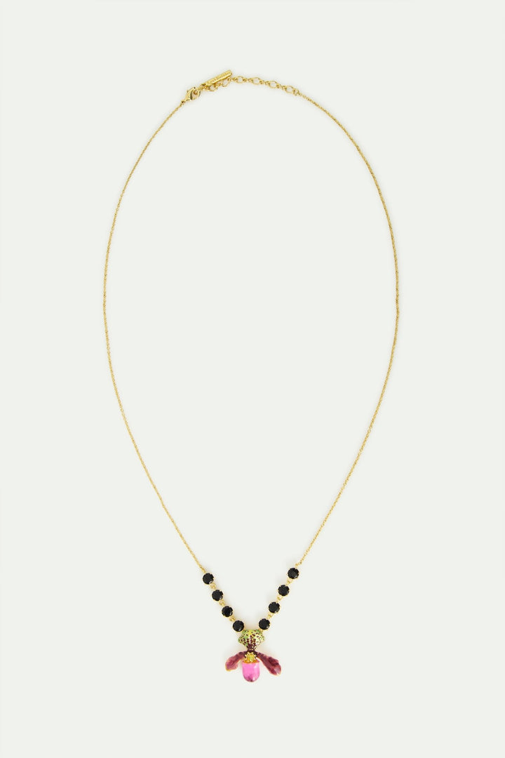 Purple lady's slipper orchid necklace, gold-plated brass chain adorned with round black faceted crystal stones. The Cabinet of Curiosities collection draws its inspiration from the fascinating world of the Natural History Museum in Paris. A dreamlike journey among rare orchids, fiery corals and sparkling beetles, offering a marvelling glimpse into the mysteries of life.