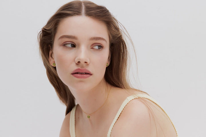 Description: Gold-plated brass and hand-enamelled green four-leaf clover earrings. This iconic lucky charm motif from Les Néréides returns, miniaturised in an intricate setting protected by nature. A delicate little talisman to whisper your wishes to, or perhaps the innocence and delight of your first piece of jewellery.