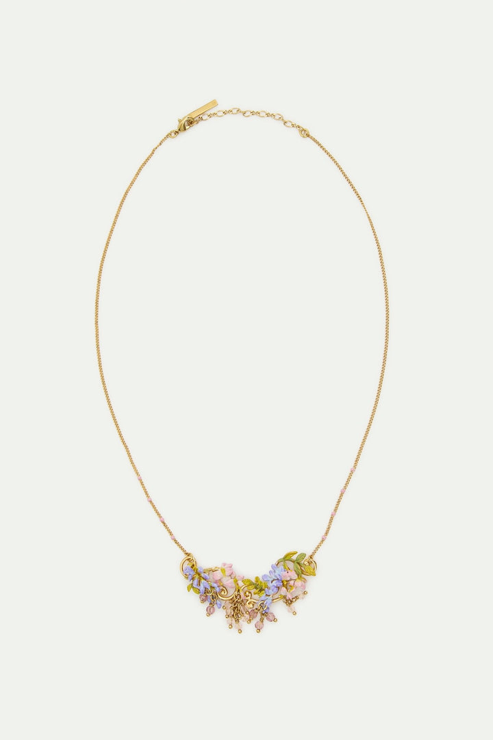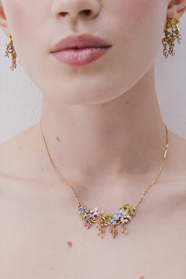 Statement necklace with hand-enamelled pink and purple wisteria on a golden arabesque, adorned with ivy and dangling faceted pink and white crystal beads, gold-plated brass. The Montmartre 1900 collection evokes a lyrical and romantic Paris, where wisteria and clematis intertwine around Art Nouveau details, embodying the effervescence of an era of art and dreams. A elegant celebration of nature and creativity, nestled between vine and stained crystal, where each piece of jewellery celebrates the dawn of a century full of promise.