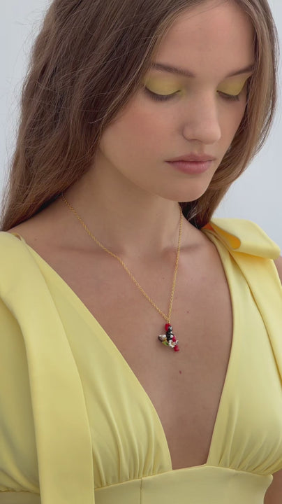 Gold-plated brass necklace with hand-painted black and white cat pendant wearing a hood and red boots, imitation pearl.Materials