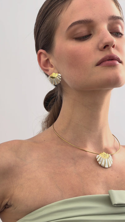 Gold-plated brass torque necklace, white and gold shell front piece in gold-plated brass, LN monogram.
