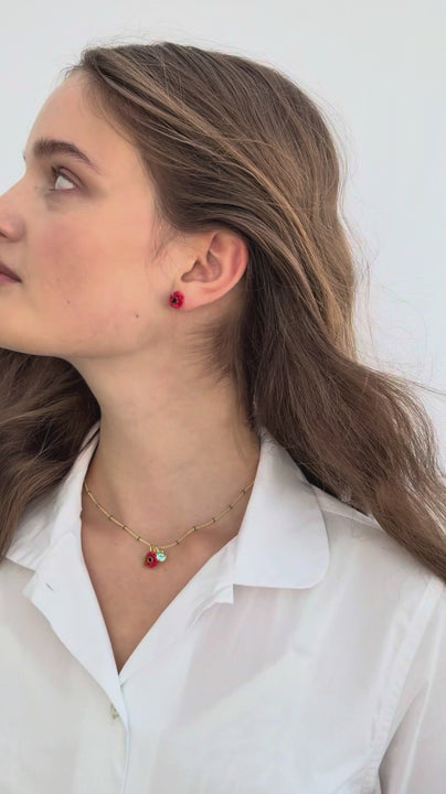 Pendant necklace with round sky blue faceted crystal stones, small hand-painted red poppy flower adorned with a black crystal in the centre. Gold-plated beaded chain, suspended on a 42 cm gold-plated brass chain.