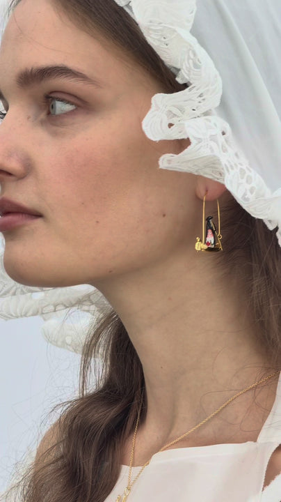 Gold-plated brass boat-shaped hook earrings, hand-painted characters, depicting a poetic scene from The Phantom of the Opera where the hero carries away the opera singer he loves on a boat.
